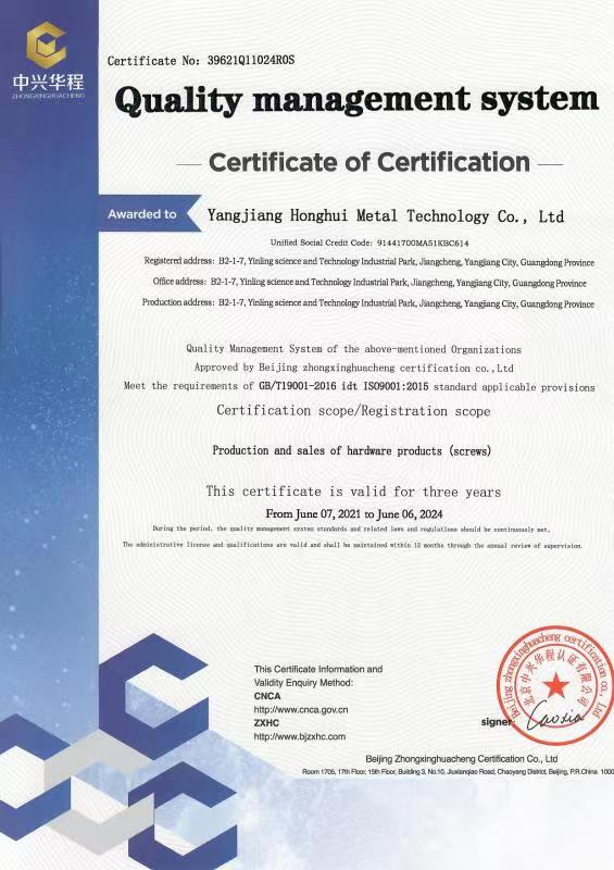 廣東宏惠金屬公司是家20多年一直專注鉆尾螺絲開發(fā)與生產的企業(yè),是國內較早做鉆尾的廠家之一,同時也是國內專業(yè)開發(fā)生產鉆尾螺絲的企業(yè)之一。 我司地址為于廣東省陽江市江銀嶺科技園距沈海高速白沙出口不到2公里,距陽江高鐵站也只有十余公里交通便利。 公司占地120畝,擁有超500臺套專業(yè)設計 生產 檢測設備。一個超200人的專業(yè)團隊,能夠嚴格按照ISO9001質量體系要求生產符合GB DIN AS3566 ANSI JIS BS等標準的產品,生產銷售各種高品質緊固件系列產品,為中高端客戶提供優(yōu)質服務。也可按照客戶要求設計生產各種鉆尾,年產高品質碳鋼 不銹鋼鉆尾螺絲2萬余噸.在各大客戶的鼎力支持下產品暢銷全國,并遠銷亞 非 拉 歐等地,在這20多年發(fā)展的道路上我司堅持“以質量求生存,以信譽求發(fā)展”的精神理念不斷完善公司體系。